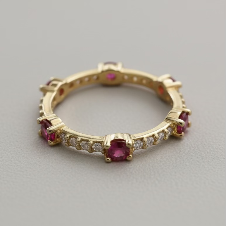 Anillo de plata bañado en oro amarillo con circones blancos y esmaltado rojo.