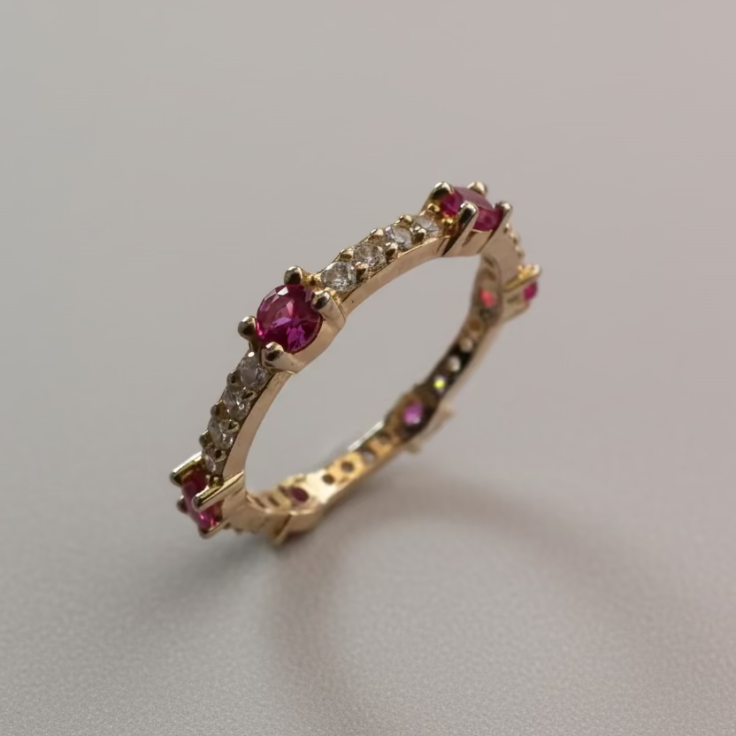 Anillo de plata 925 bañado en oro amarillo con circones blancos y rosados.