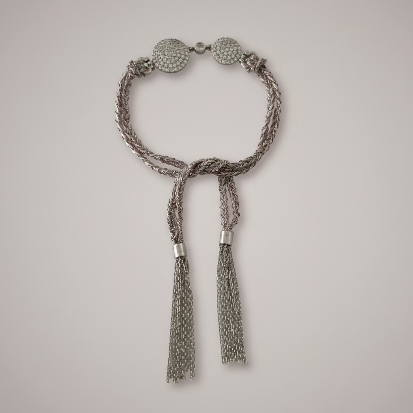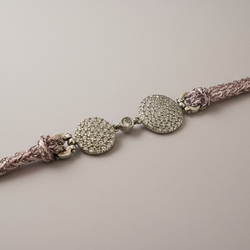 Pulsera de hilo color lila acompañado con cadena de plata y dije con circones blancos.