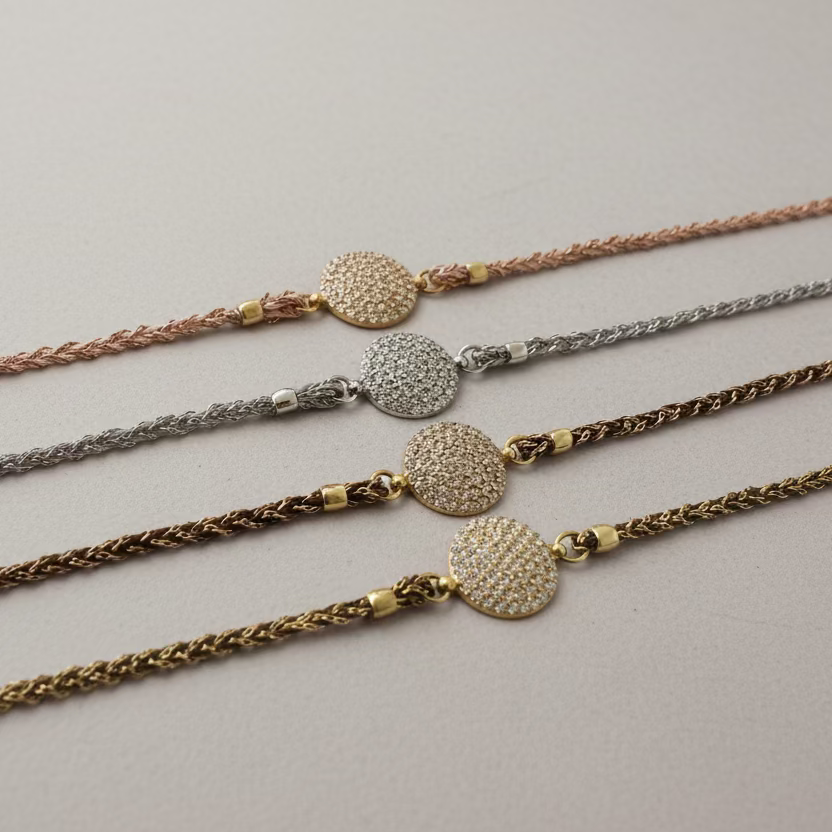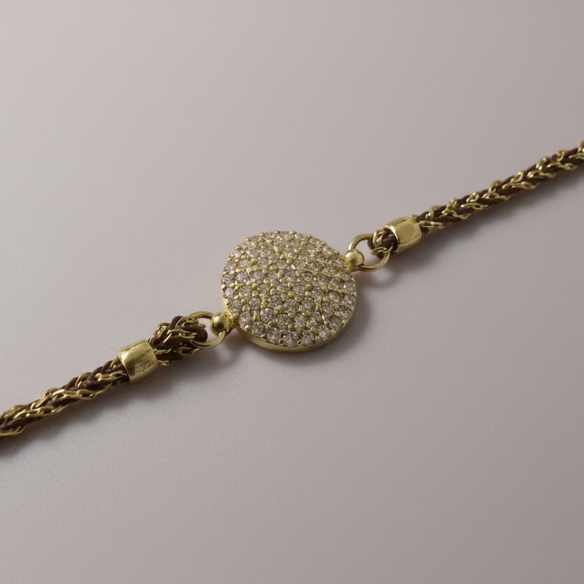 Pulsera de hilo de seda con cadena de plata bañado en oro y dije con circones blancos.